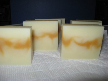 白地に オレンジ色の・・・ちょっと波々のライン入りの石けんを